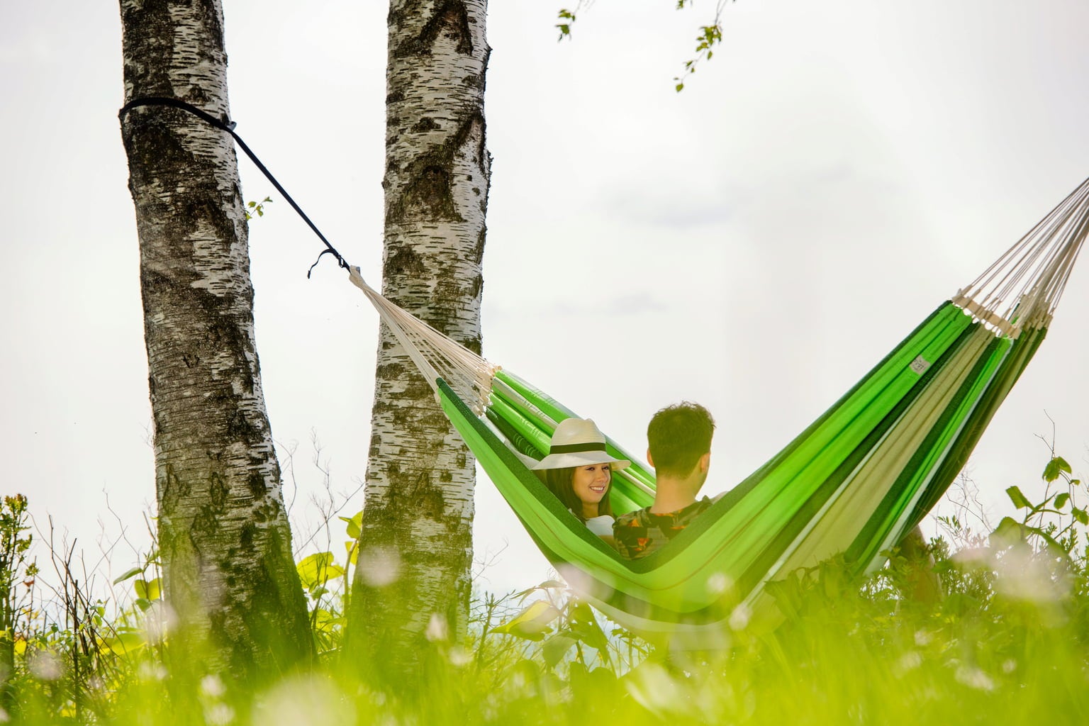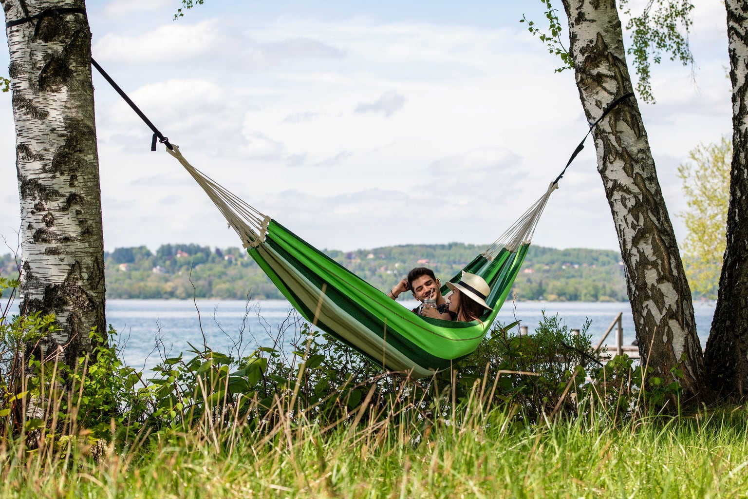 You can hang up the hammock in the traditional manner between two trees or attach it to two wall hooks inside your home. It is quick and easy to hang up and ready for use in no time. The high-quality workmanship guarantees many years of use. The hand-woven and double 5-stitched eyelets form a stable base for the numerous hanging cords. The hand-woven ribbon incorporated into the suspension cords is a special detail. It not only provides a visual accent, but also equalises pressure points and enables the hammock to be fanned out perfectly. Whether on holiday, at home, indoors or outdoors - the Paradiso is your ideal companion for pure relaxation!