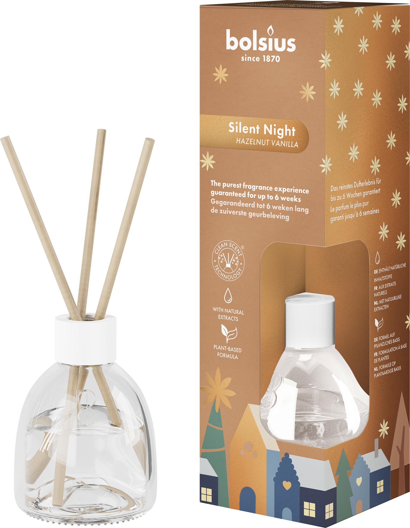 With the True Glow Room Fragrance by bolsius, you can create a warm atmosphere in your home in no time at all. For up to 6 weeks, the room fragrance exudes wintery scents and ensures cosy moments of well-being time and time again. The plant-based formula is enriched with natural extracts.