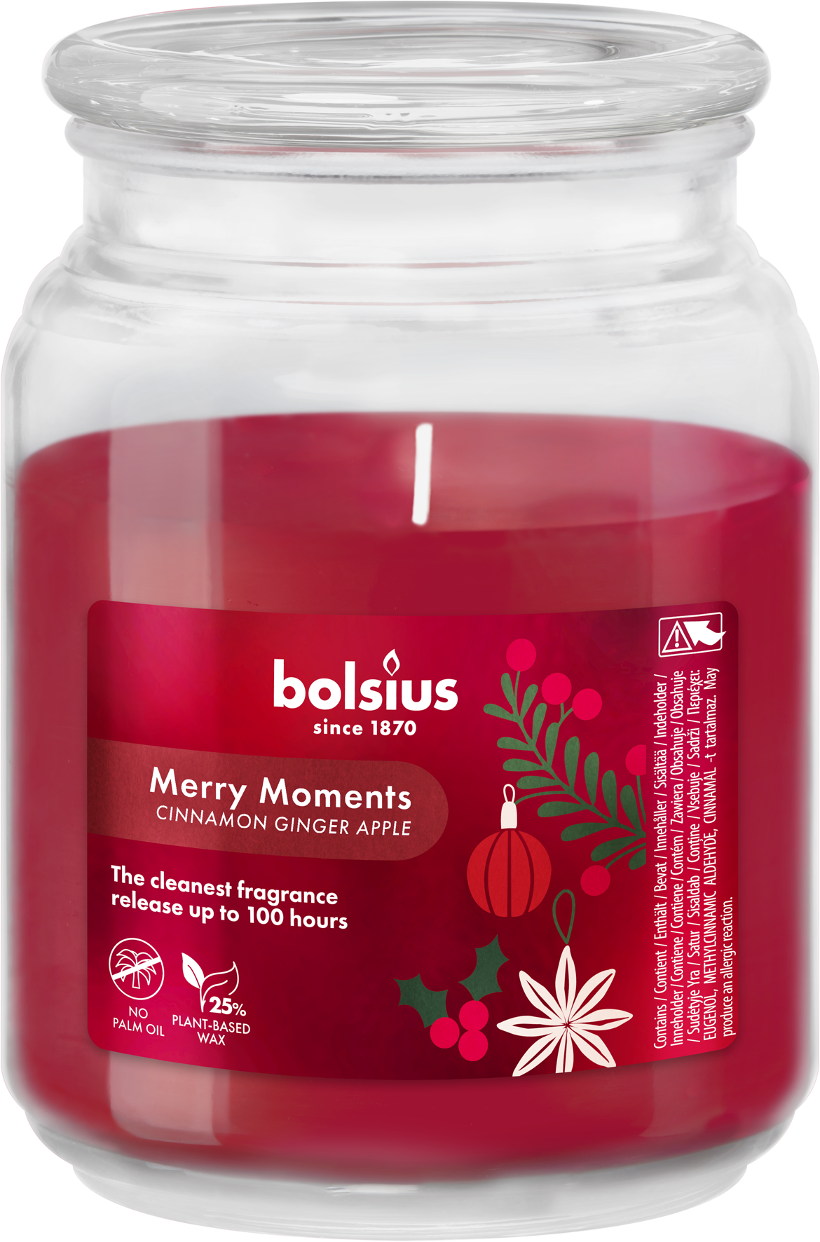 The Merry Moments Scented Candle by Bolsius enchants with its warm, spicy scent of cinnamon, ginger and baked apple. Its wintery fragrance notes create a long-lasting, cosy atmosphere in your living space. The candle is free from palm oil and enriched with natural extracts.