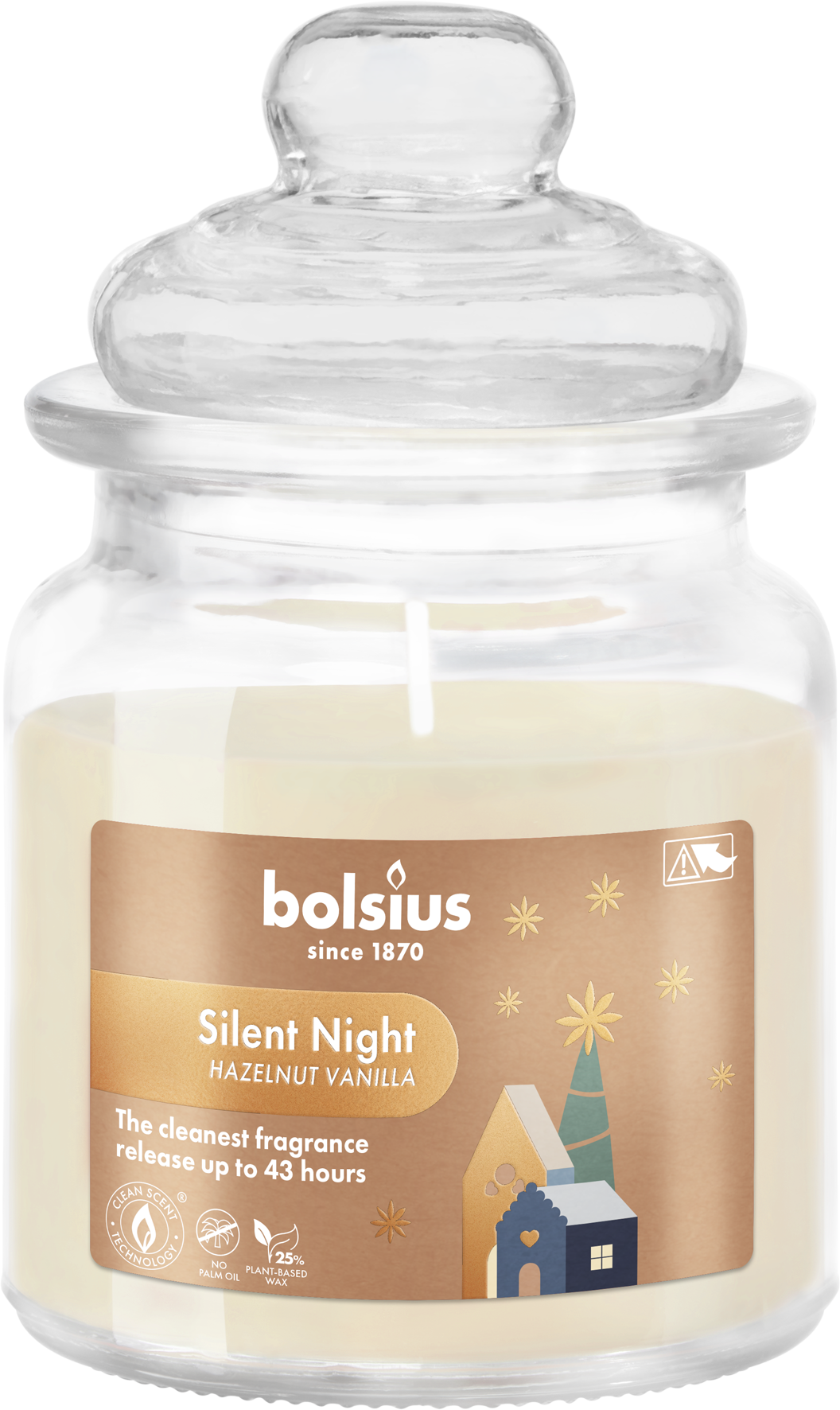 The Silent Night Scented Candle by bolsius enchants with its gentle scent of hazelnut, roasted almonds and vanilla. The warm, wintery fragrance creates a cosy atmosphere in your home. The candle is enriched with natural extracts, without any palm oil.