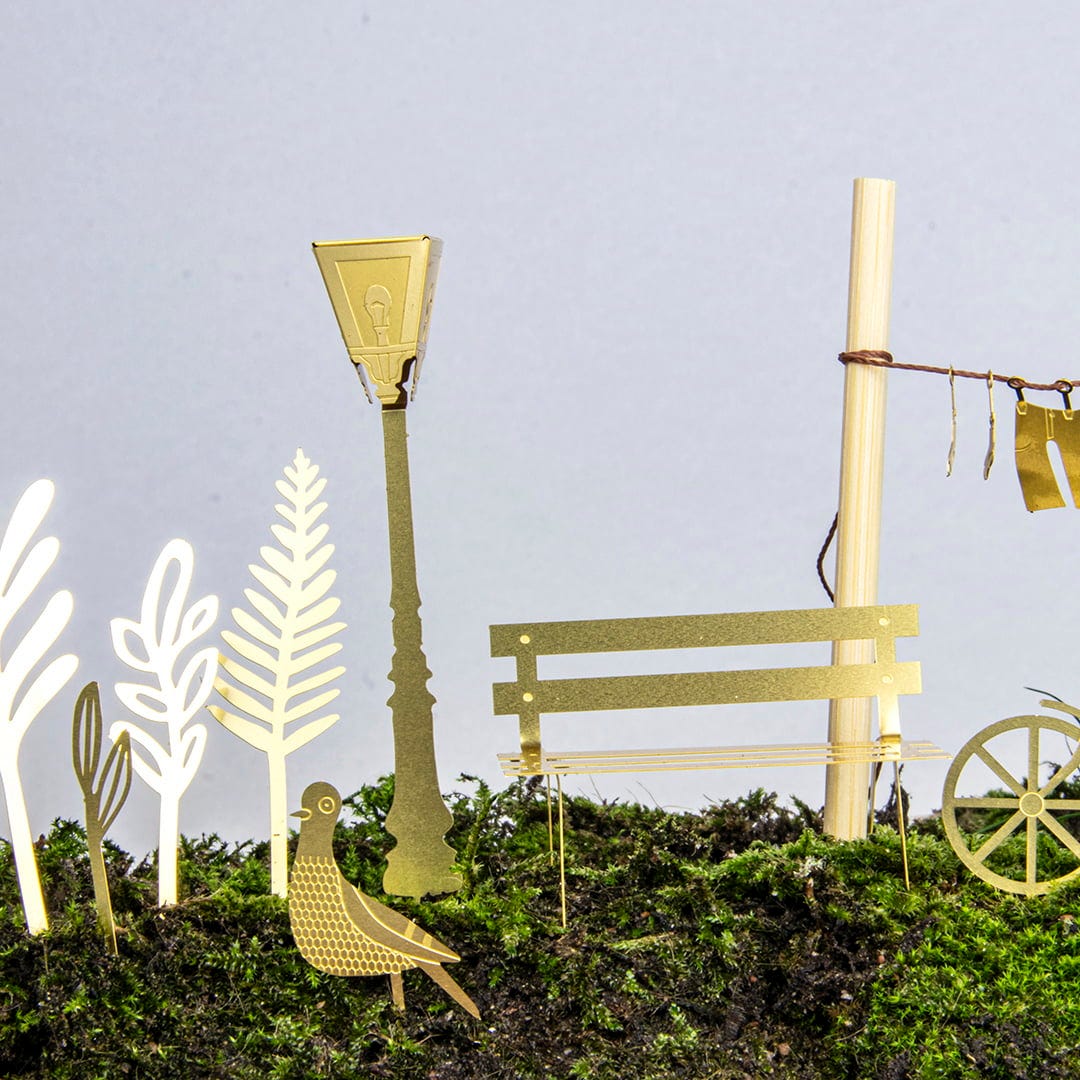 - Set consisting of a bicycle, a bench, a street lamp, a clothesline, a signpost, four plant stems, and three animals