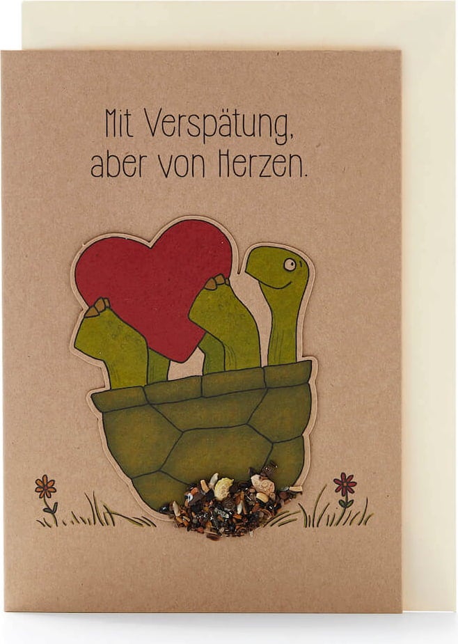 Since turtles are not the speediest of animals, it can take a little longer for wishes to arrive. However, the joy is all the greater when the bearer is as sweet as on this card. And the best thing is: In addition to warm wishes, the little turtle also bears seeds which will grow into beautiful wildflowers once sown. Simply detach the turtle from the card, place it in soil and keep it moist.