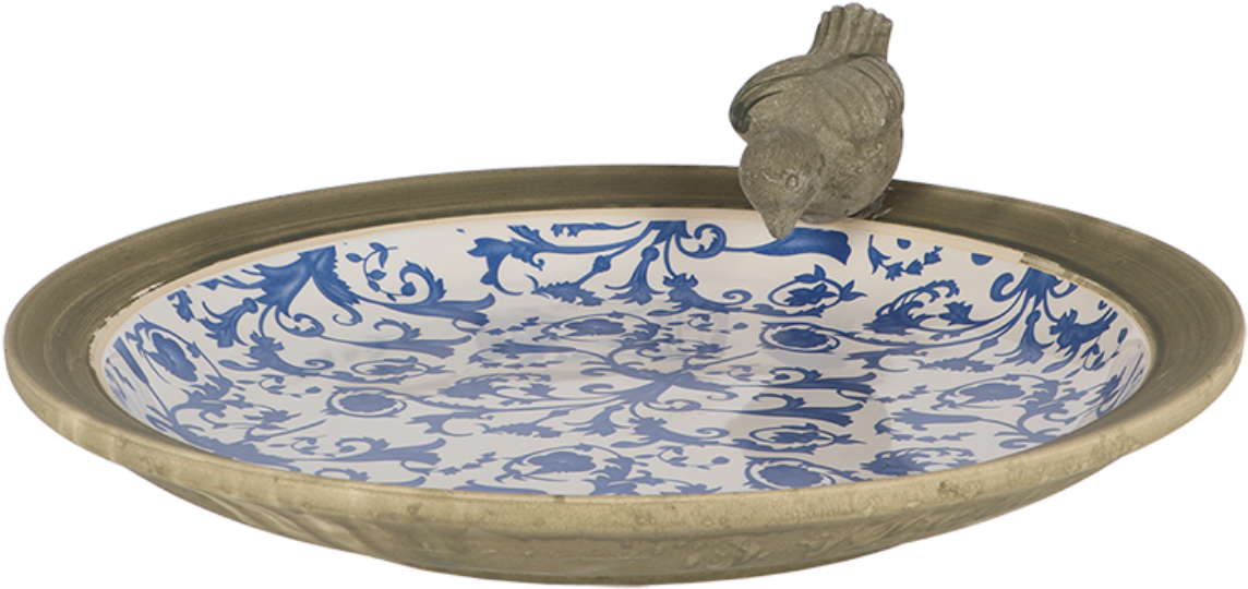 This attractive birdbath in a chic "aged" design features a crackled ceramic aesthetic and a beautiful blue baroque motif - the little ceramic bird perched on the edge is an adorable addition! So you can provide the birds that visit your garden or balcony a comfortable place to bathe and drink.