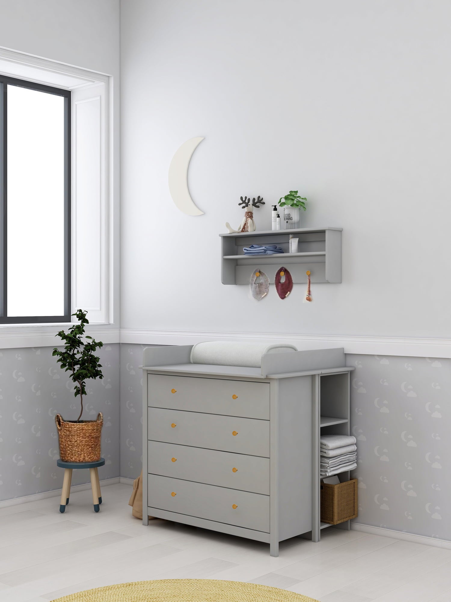 You can use the top of your LUNA chest of drawers as a diaper changing table by attaching this clever accessory. It is made of sturdy MDF and can be easily removed once you no longer need it. The area around the chest of drawers can be used to put up matching shelves so that all necessary supplies such as diapers and wipes are conveniently within arm's reach.