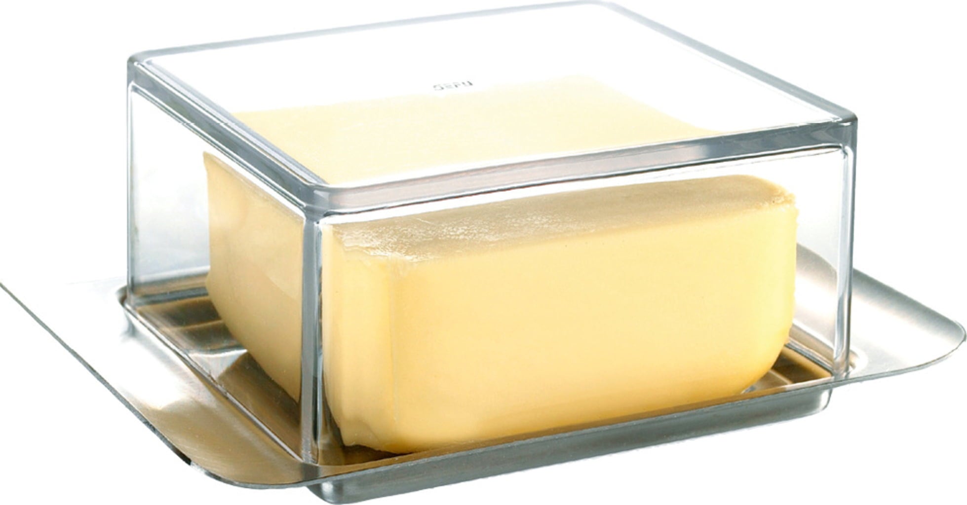 The BRUNCH Butter Dish is the perfect accessory for both your breakfast table and your refrigerator! Its sleek base, made of high-grade stainless steel, fits neatly into the door compartment of most standard refrigerators. The generously sized plastic dome resembles glass, yet is significantly hardier and is comfortable to hold thanks to the ergonomic grip bars.