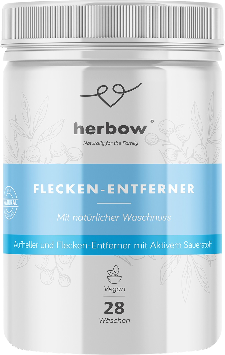 The herbow Stain Remover & Brightener contains natural soapnuts and activated oxygen. It is gentle on the skin and white laundry yet effectively cleans and removes stains.