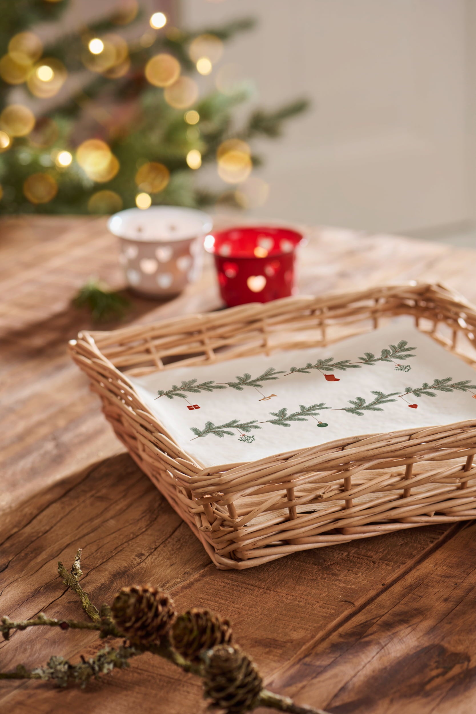 This handmade wicker basket is a particularly stylish table accessory to hold napkins. A chic addition to a tasteful table setting.