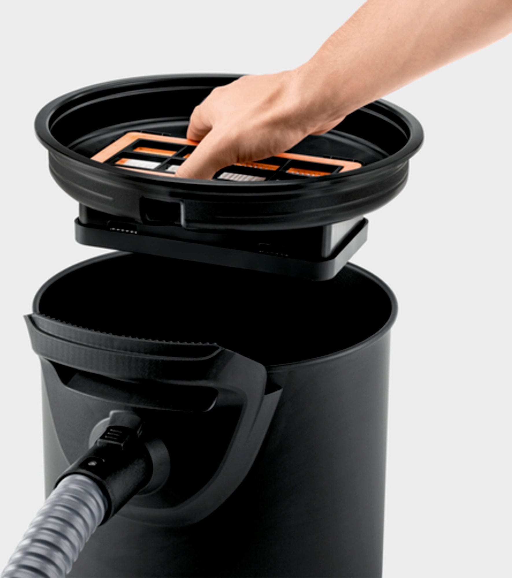 Performance never drops thanks to the integrated filter cleaning system; with a simple press of a button, the filter is cleared to restore maximum suction instantly. Safety is paramount, which is why the unit features a robust one-piece filtration system—combining a flat pleated filter and a metal coarse dirt filter—and is constructed entirely from flame-resistant materials for secure ash collection.