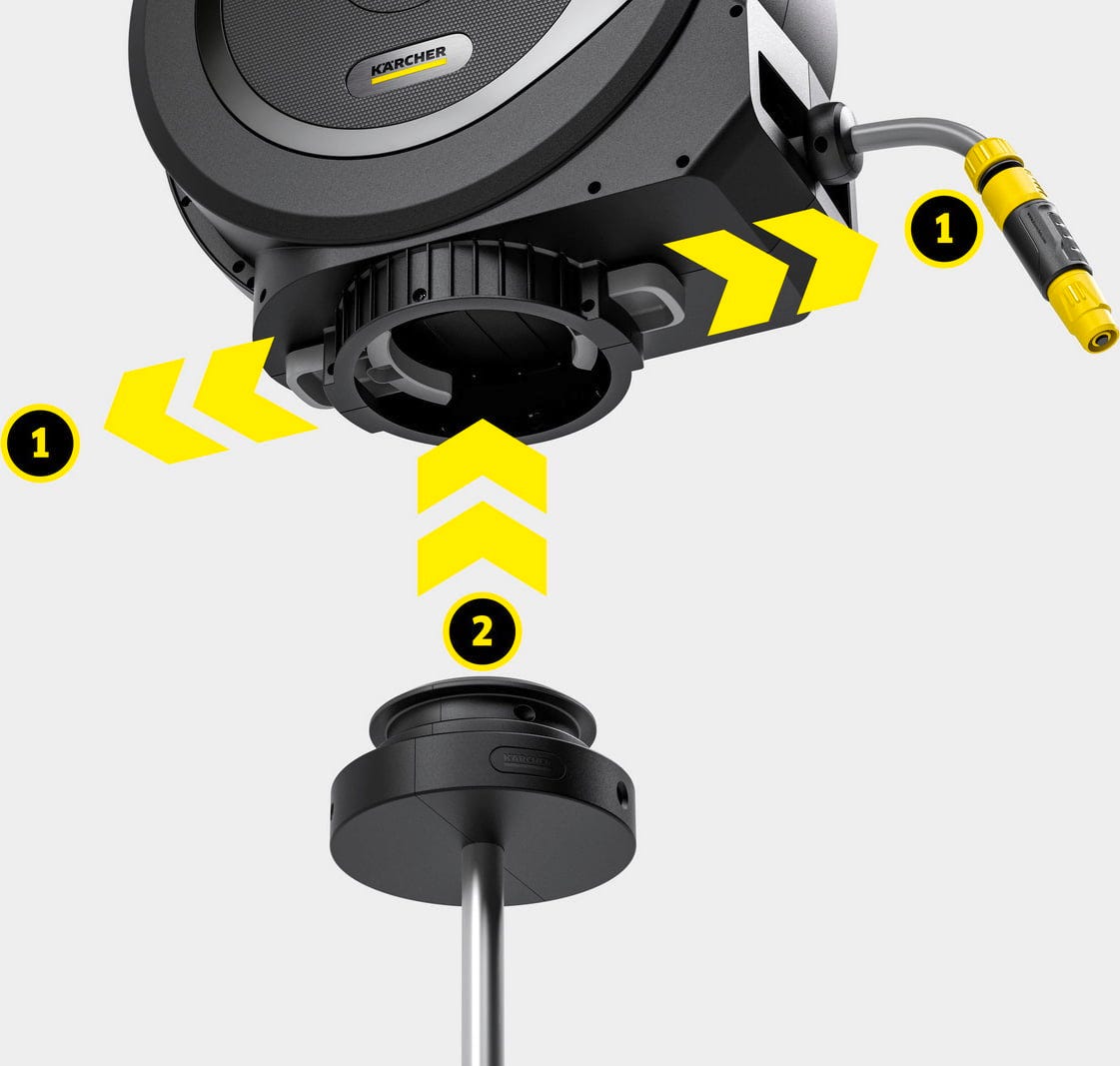 In combination with a Kärcher hose box, this creates an exceptionally flexible garden hose system. Once mounted, the box can be rotated by 360°, allowing the hose to be guided freely while watering. This reduces hose kinks and makes using a hose reel for garden irrigation around flower beds, lawns, or planted areas much easier. Thanks to FlexChange technology, the hose box can be placed onto or removed from the ground spike without any tools. This allows you to use the garden hose reel precisely where you need water.