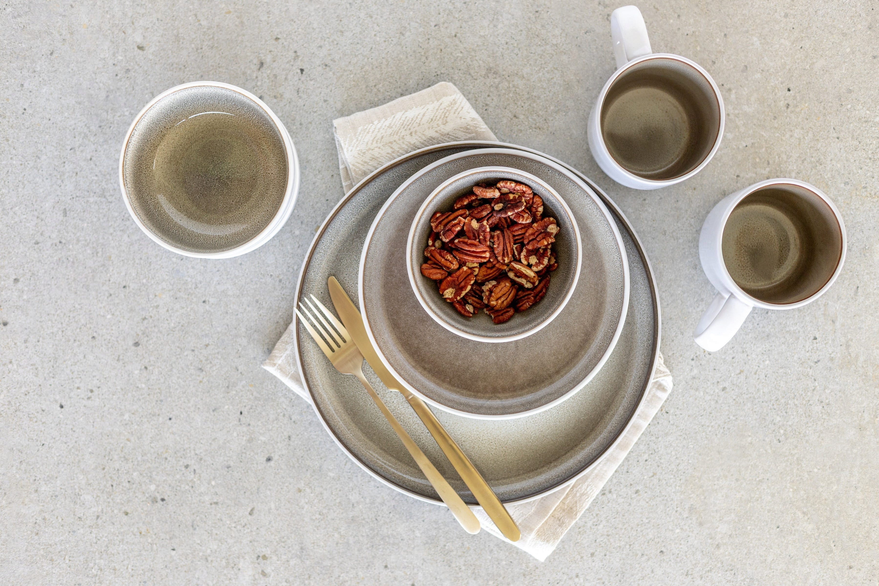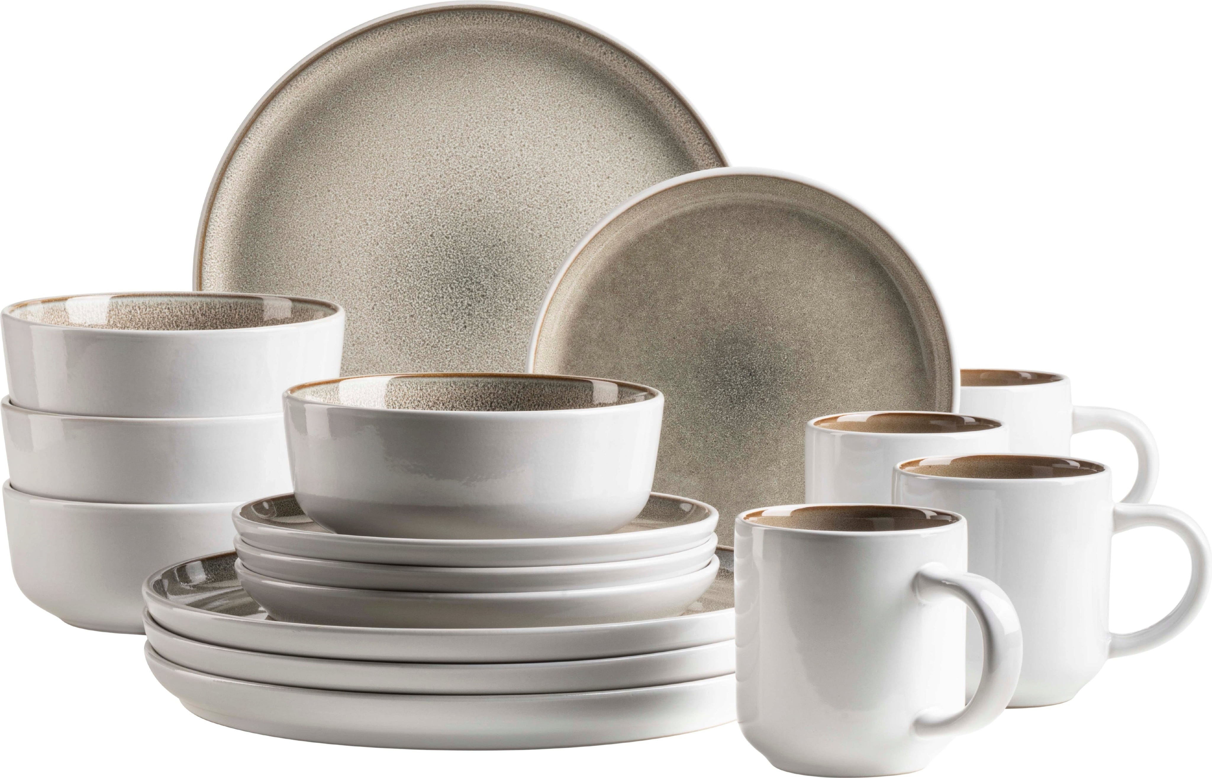 Give your dining table a warm, modern atmosphere with the 16-piece Lunaria combination service by Mäser, which impresses with its unique combination of a cream-colored exterior and a fascinating brown reactive glaze on the inside. Since the special glazing technique develops individually for each piece in the kiln, you receive a set for four people that consists of truly unique items, each with its own personal character through vibrant color gradients and patterns.