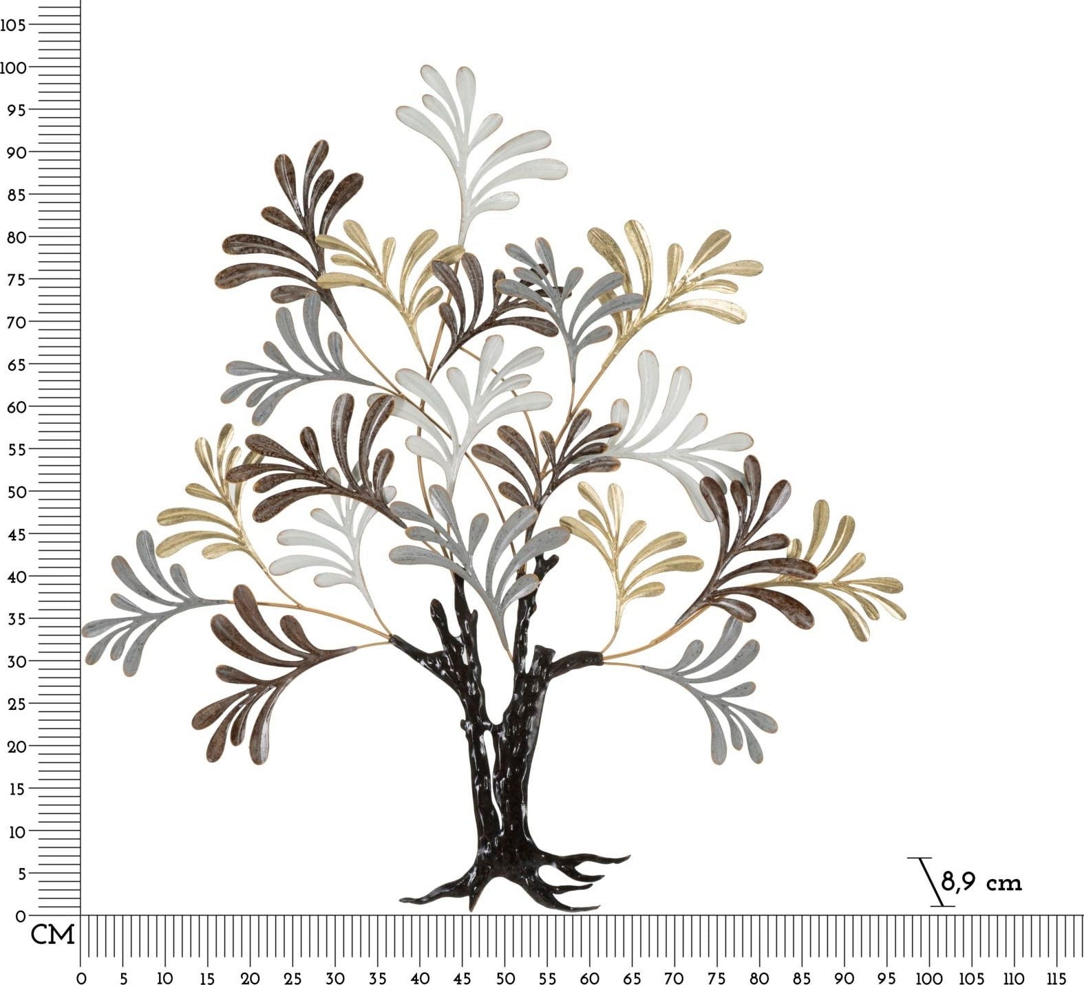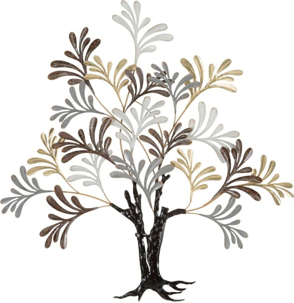 Bring a harmonious and modern aesthetic to your home with the Albero Lixy wall decoration by Mauro Ferretti. This decorative 3D metal wall panel impresses with its depiction of a tree with simple, stylized features that radiate timeless elegance. The design is characterized by a dark patinated trunk, from which filigree branches with leaves in an elegant mix of white, gold, grey, and brown emerge.