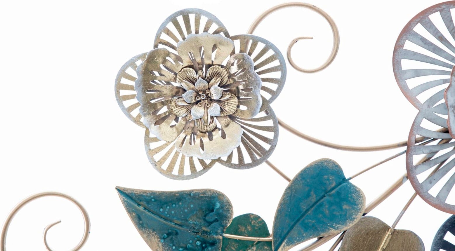 Set a glamorous highlight with the Campur -B- Wall Decoration by Mauro Ferretti. This expansive 3D metal panel captures the beauty of a blooming garden and transforms it into a luxurious work of art for your wall. The design impresses with delicate, fan-shaped blossoms in gold, cream, and dark accents, harmoniously complemented by emerald green leaves in an antique look.
