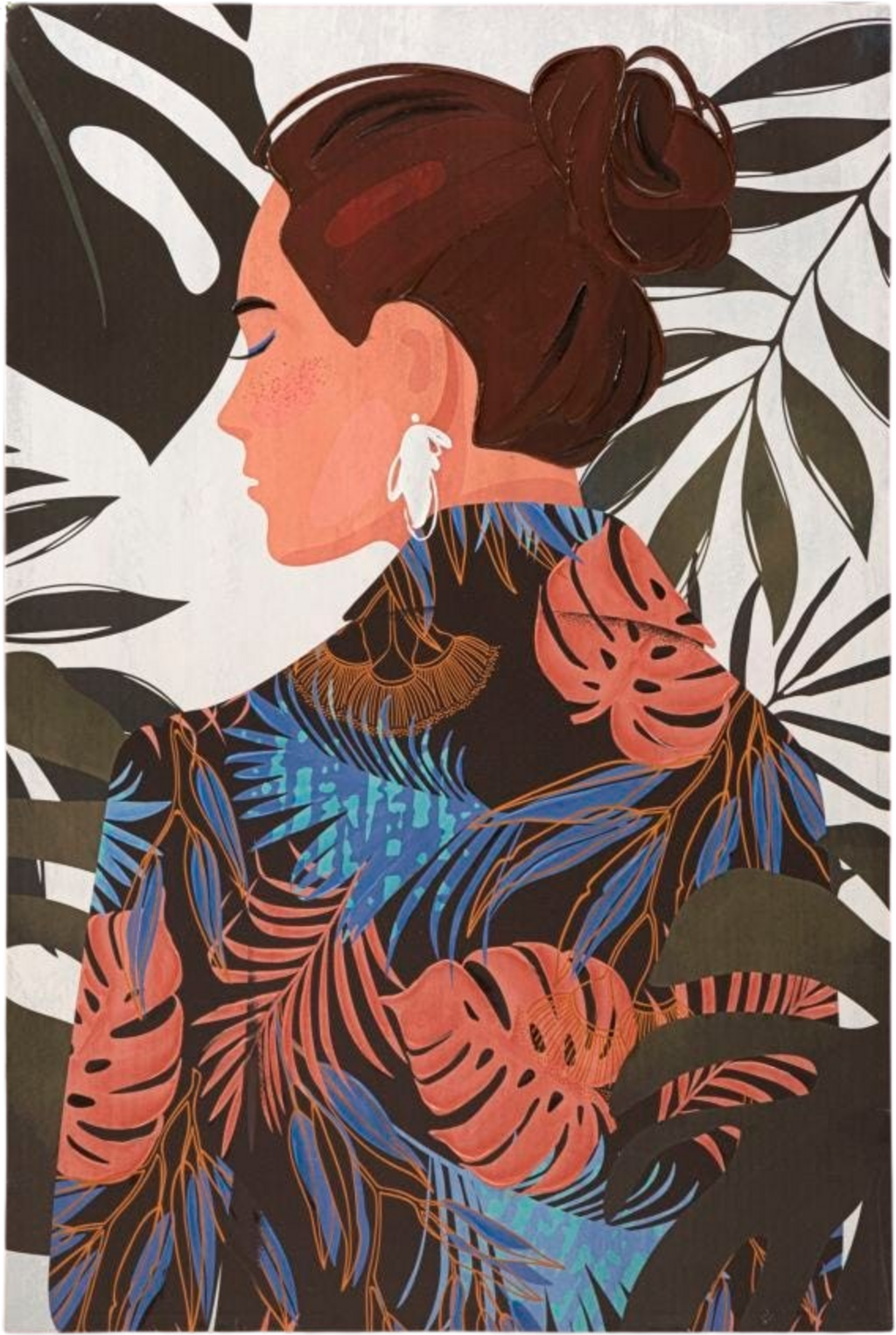 The motif shows the back view of a woman with elegantly pinned-up hair against a backdrop of contrasting jungle leaves. The play of colors is particularly fascinating: her artistically patterned garment combines warm terracotta tones with cool blue nuances, while the monstera leaves in the background set accents in dark green and bright white. Stretched on a sturdy wooden frame, this picture is an exclusive eye-catcher for everyone who loves modern design with a touch of wanderlust.