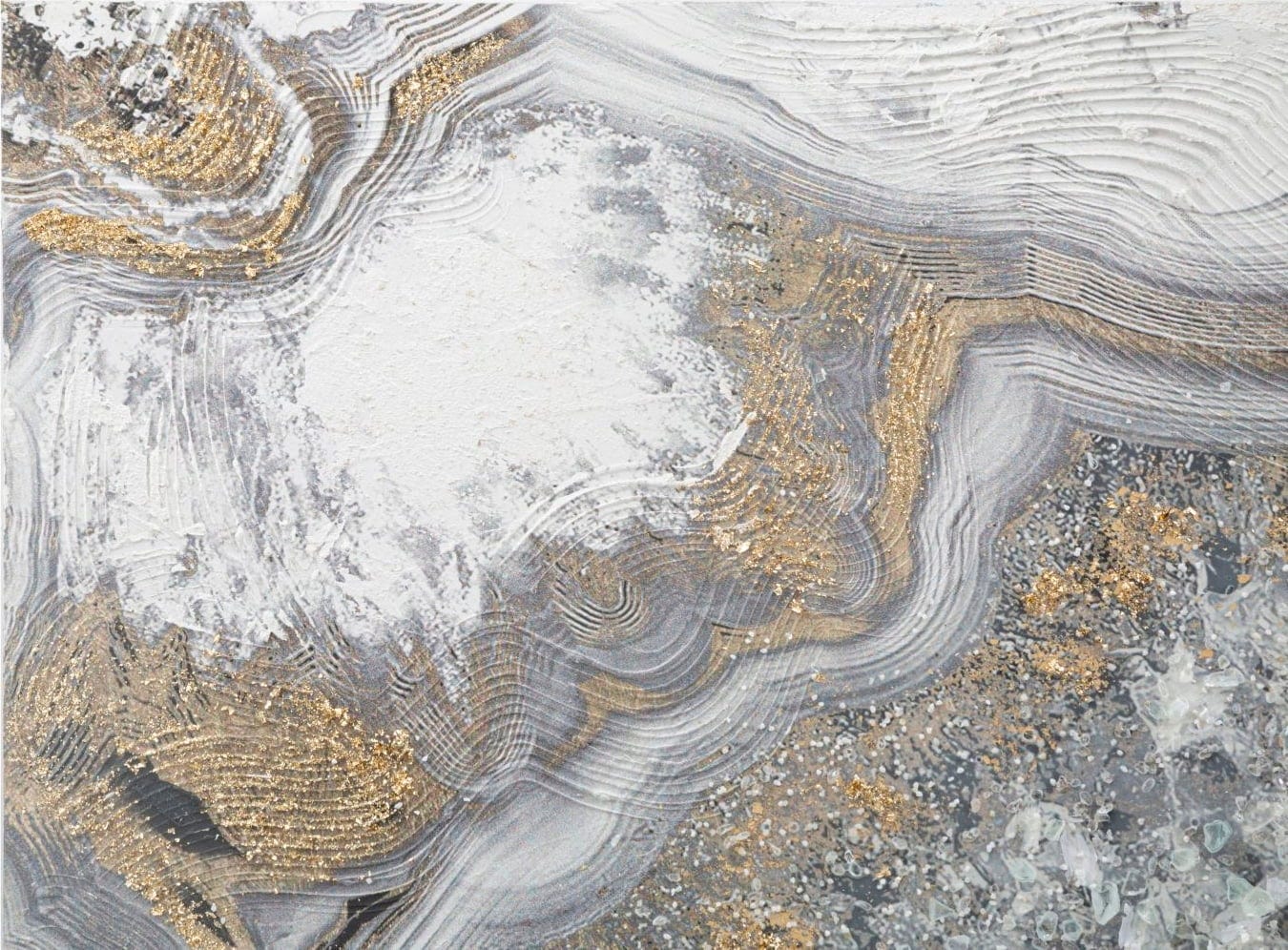 The design impresses with a striking geological structure reminiscent of the interior of a precious geode or a mysterious cave. Interlocking layers of elegant grey, anthracite, and cream white form a complex relief brought to life by magnificent golden veins and glittering inclusions. Stretched on a high-quality wooden frame, this piece is a true eye-catcher that stylishly blurs the boundaries between nature and modern art.