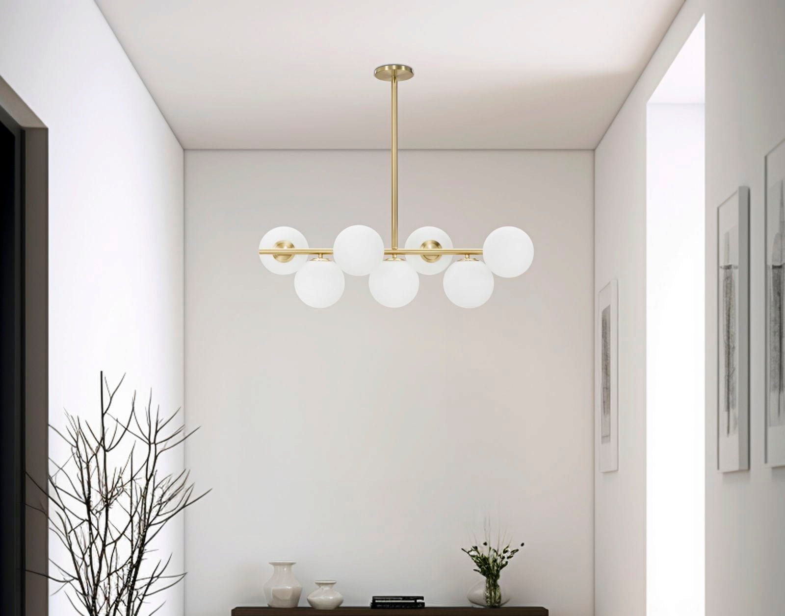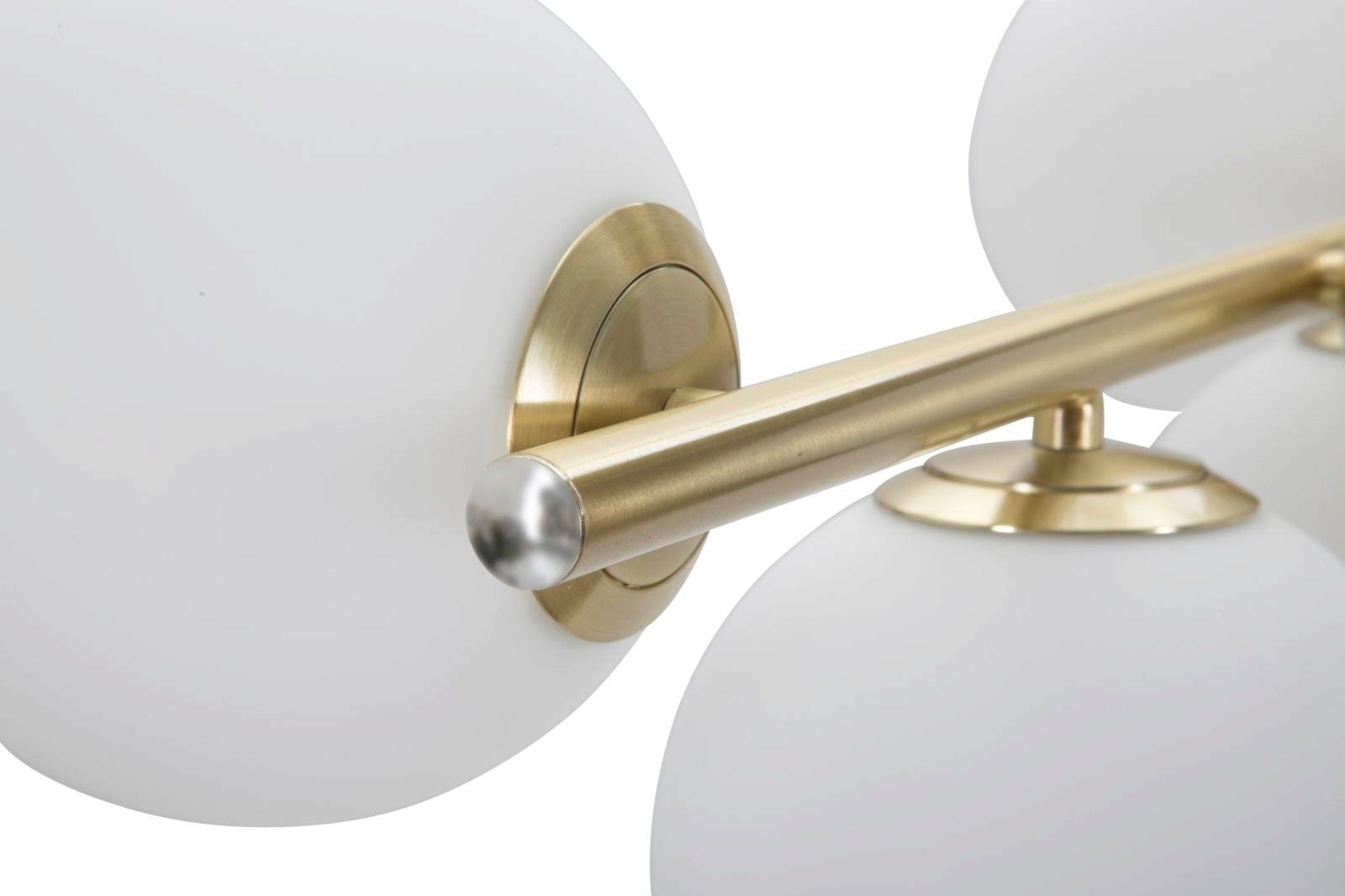 The gold-colored metal frame impresses with its clean, essential lines, along which the seven white glass globes are arranged in a harmonious, slightly staggered row. This combination of a sophisticated gold finish and the soft, diffused light from the glass globes creates a unique atmosphere of refinement and warmth. Whether above the dining table or as a central element in the living room – the Glamy makes a stylish statement for exclusive home design!