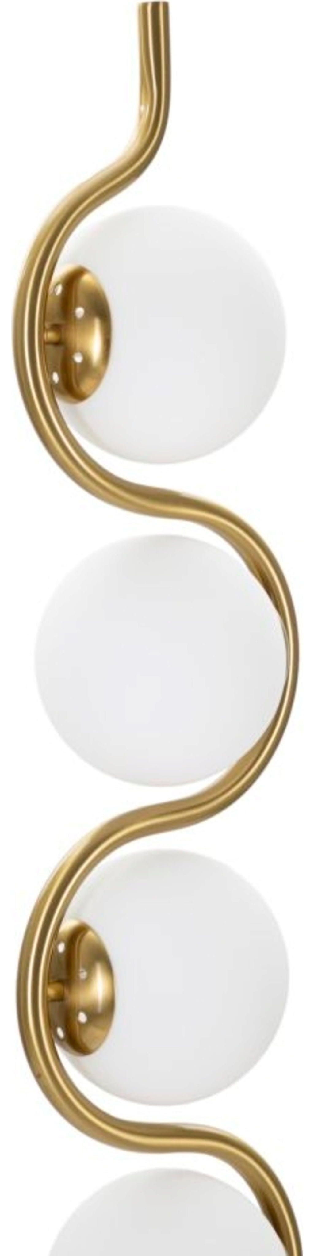 The heart of the design is the S-shaped metal rod, in whose curves four elegant white glass spheres are embedded. These four light points provide soft, glare-free illumination and create a warm atmosphere of well-being. The combination of the luxurious gold finish and the opal white spheres gives the lamp a timeless elegance that refines both modern and classic interiors.