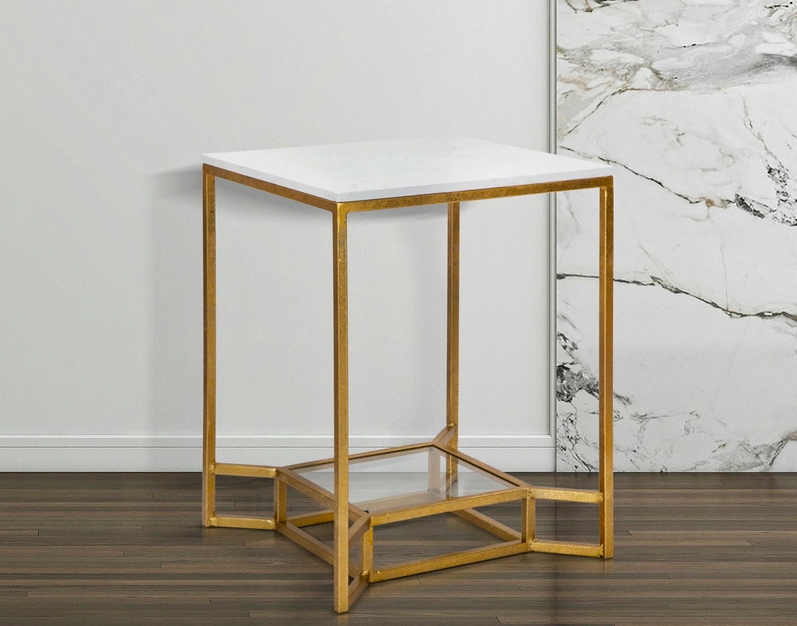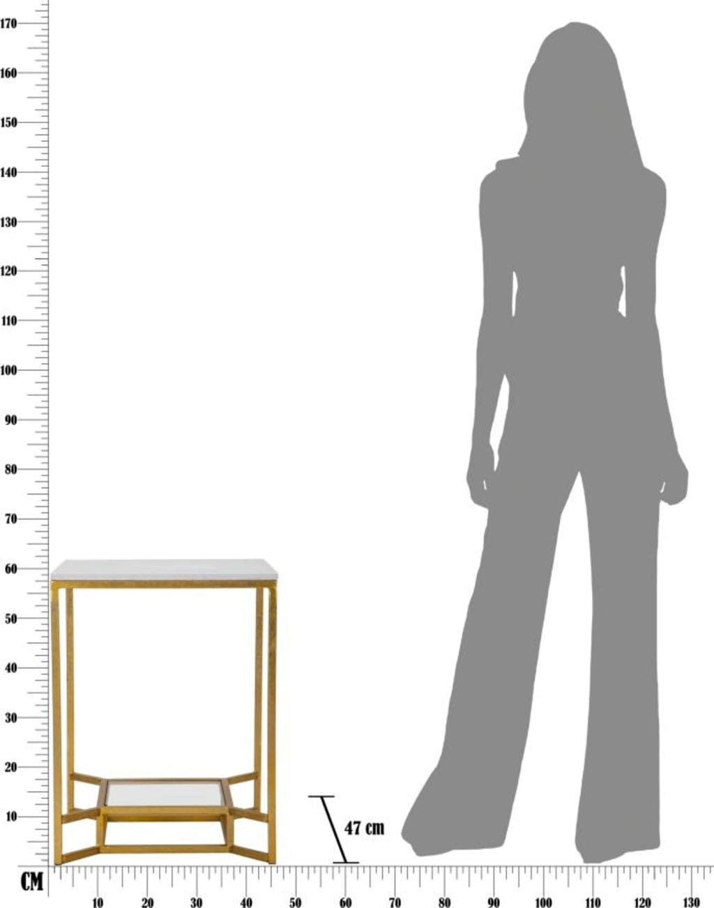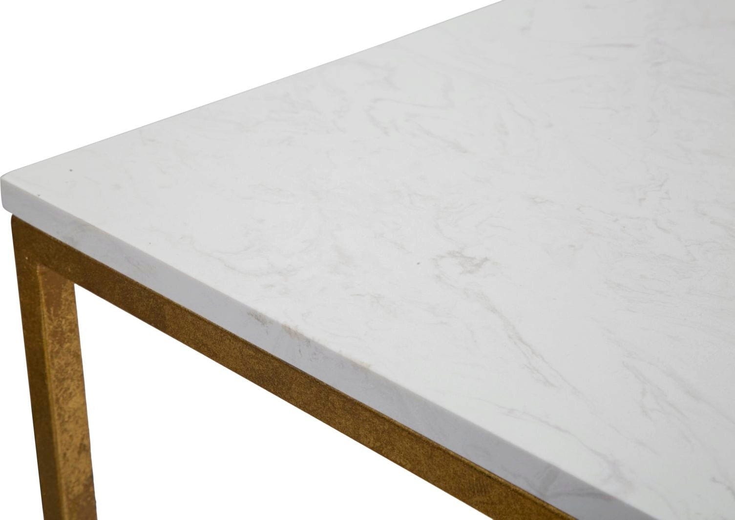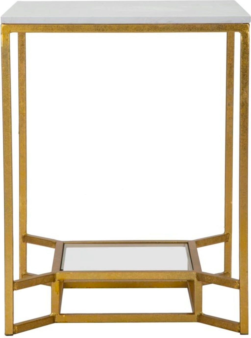 The top plate made of artificial white marble offers a luxurious surface, while the lower shelf made of clear glass provides visual lightness and additional storage space. The harmonious combination of shiny gold, cool glass, and natural marble makes this table an exclusive centerpiece in your home!