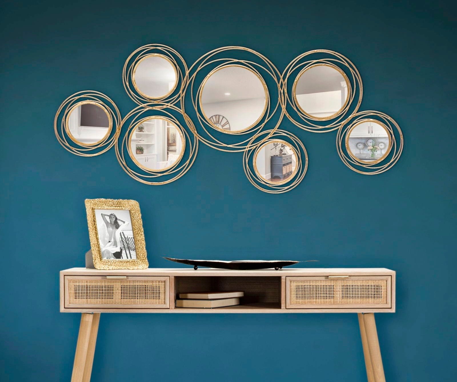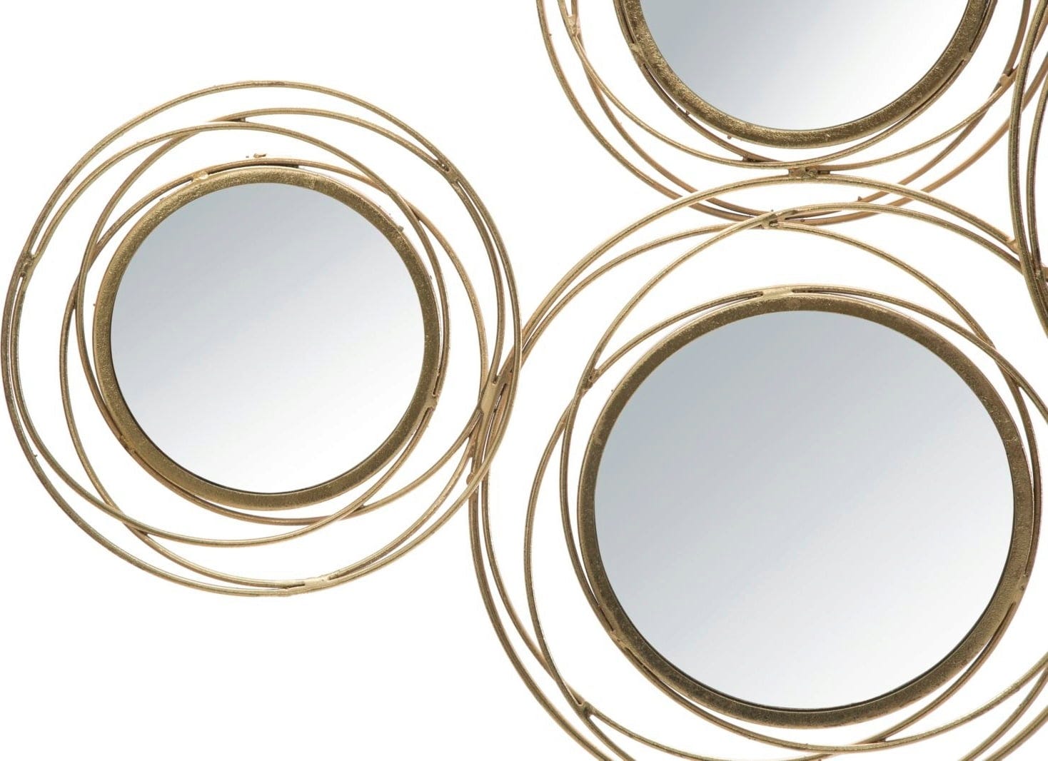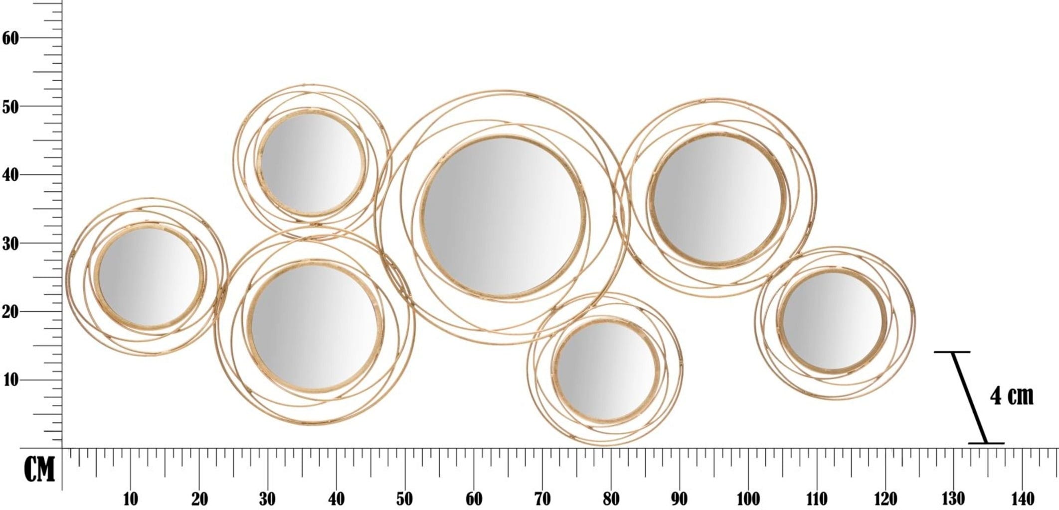 Make a glamorous statement in your home with the Mirrors Gold Wall Decoration by Mauro Ferretti. This artistic composition of gold metal panels picks up on the latest trend in 3D wall design and gives every room a surprising, lively atmosphere. The geometric arrangement of various circles and integrated mirror elements, with their delicate, multiple borders, looks almost like an abstract work of art that plays with light and shadow.