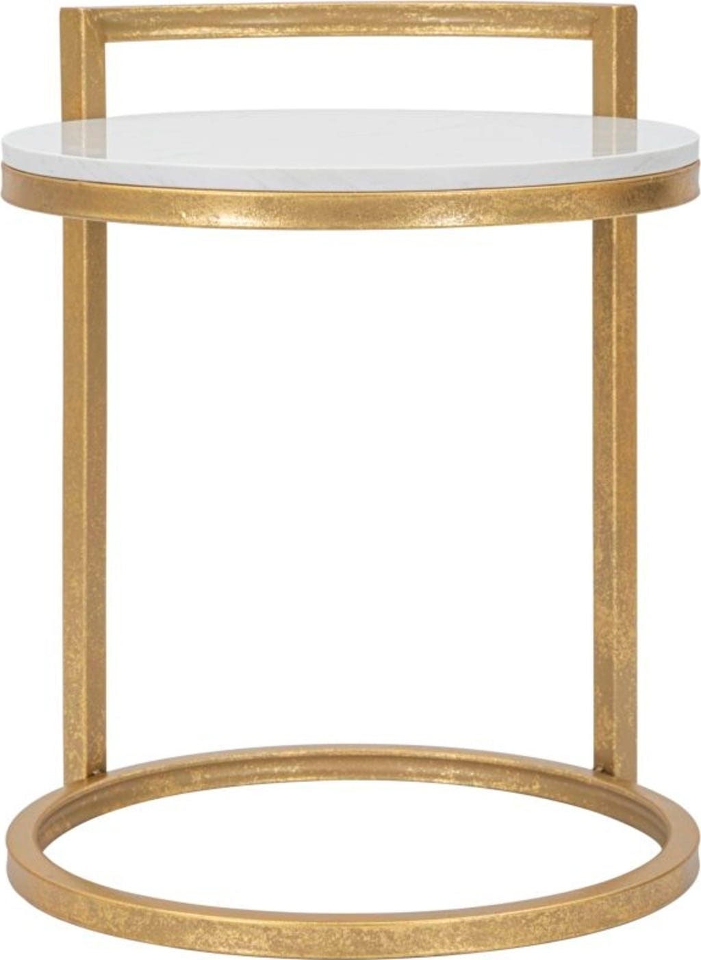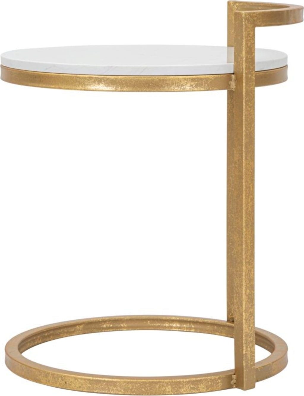 The C-shaped frame made of gold-coloured metal with an antique finish allows you to slide the table very close to your sofa or armchair. The design is crowned by an elegant white marble top, whose cool elegance harmonises perfectly with the warm gold tone of the metal. Whether as a stylish surface for your favourite book or as an exclusive pedestal for your decorations – this table adds luxurious accents everywhere!