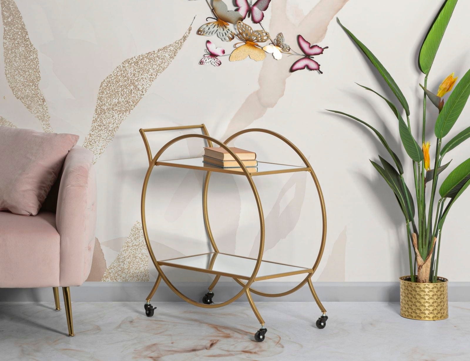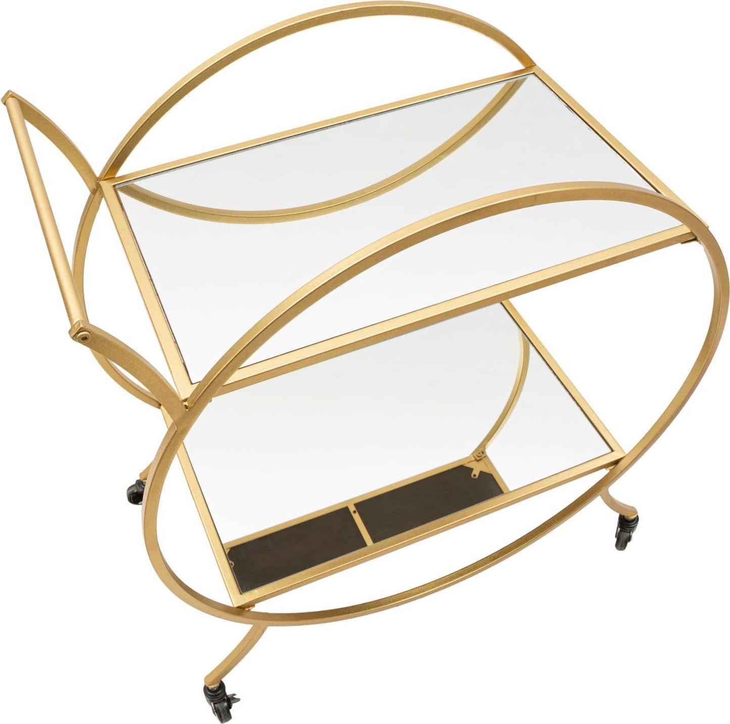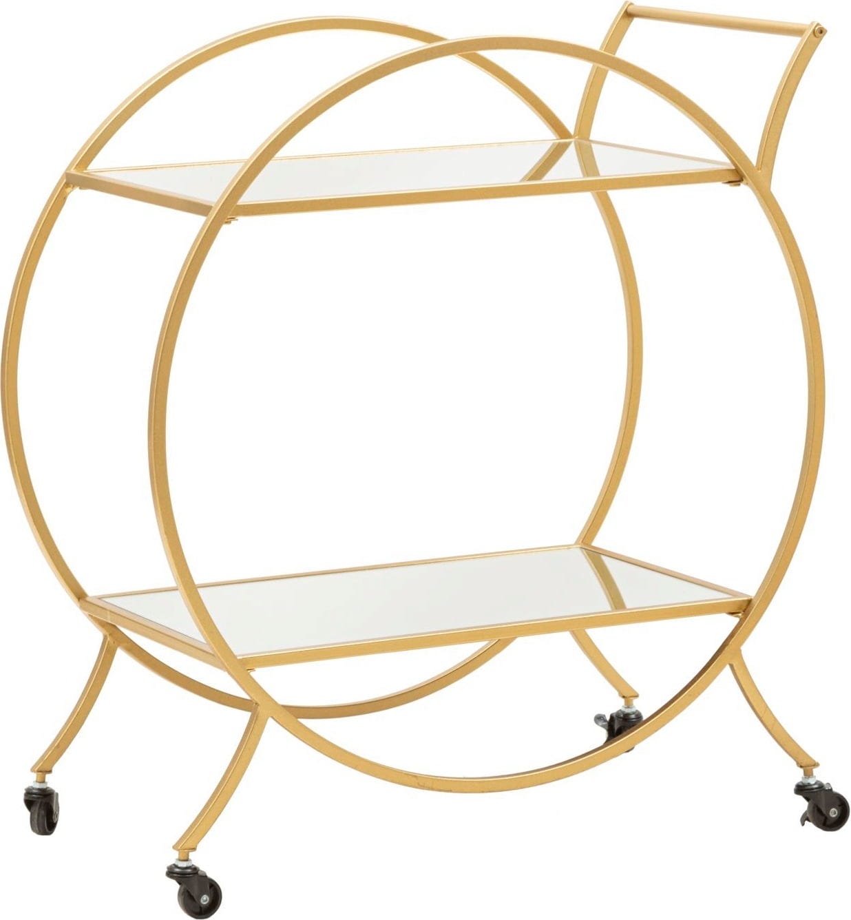 These rounded lines give the piece of furniture a particularly soft and harmonious look. Equipped with two elegant, mirrored glass shelves, the trolley offers the perfect stage for fine decanters and glasses. Thanks to the four practical castors and the integrated handle, it can be moved effortlessly and flexibly. A touch of Hollywood Regency style that brings functionality and glamour to your home!