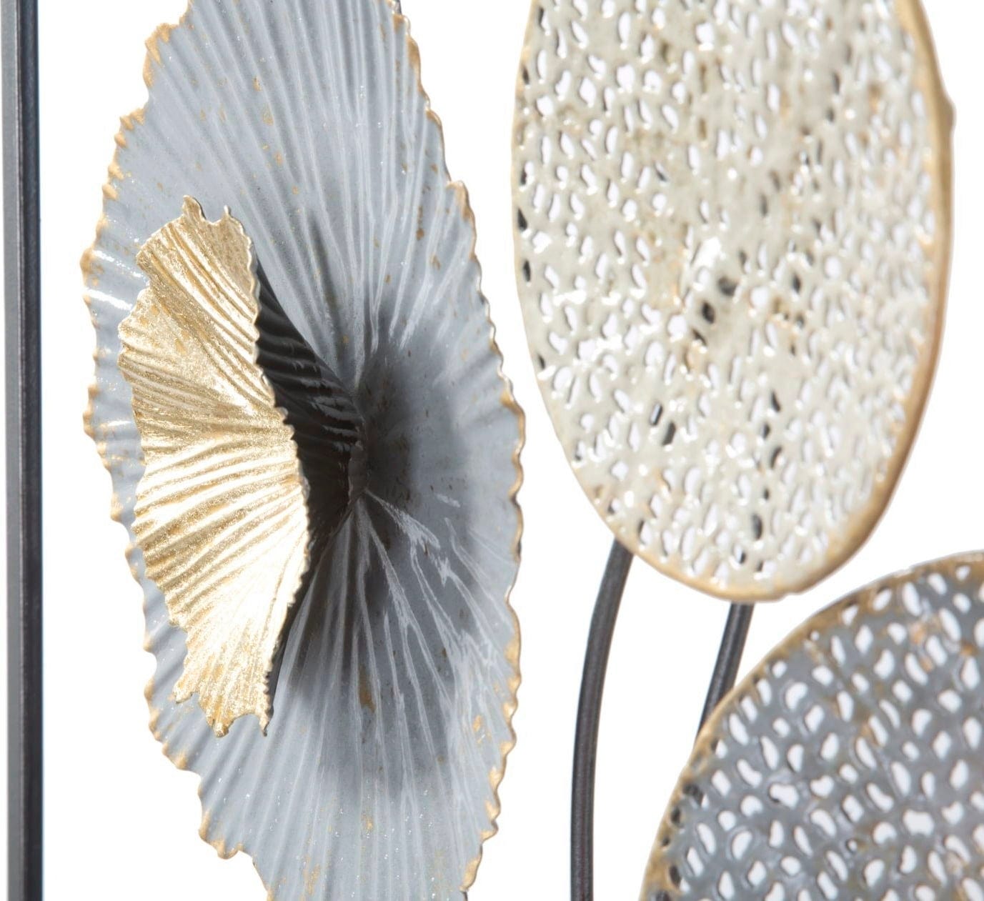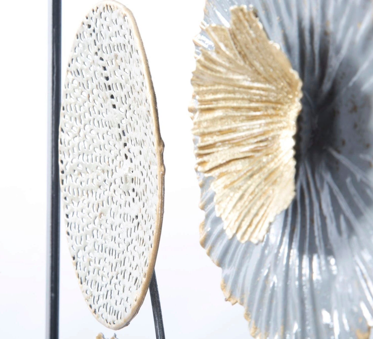 The exciting contrast between cool grey tones and warm, shimmering gold accents gives every room a luxurious touch and surprising depth. Thanks to the delicate cut-outs, the object appears light despite its sculptural presence and allows your wall colour to subtly shine through.