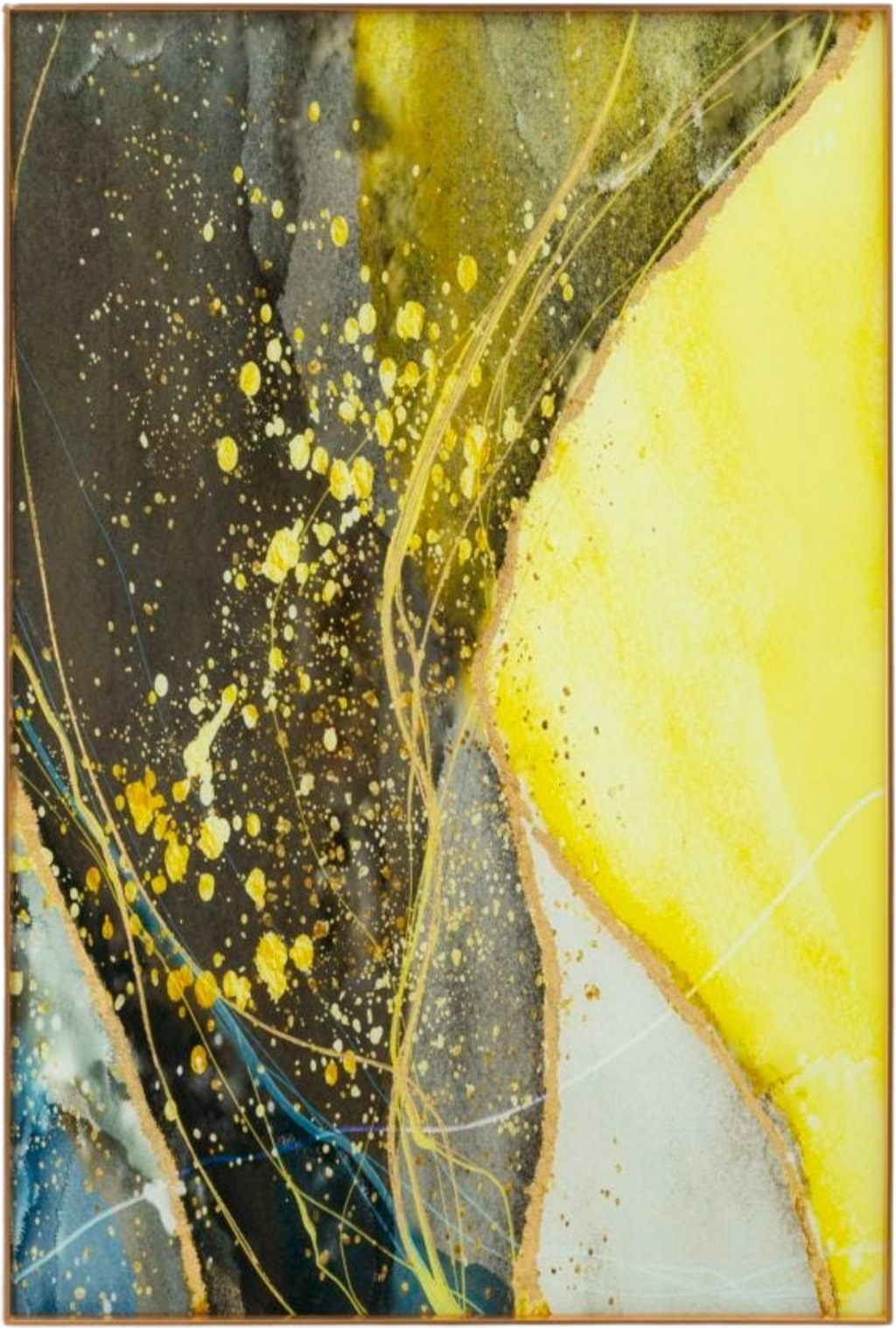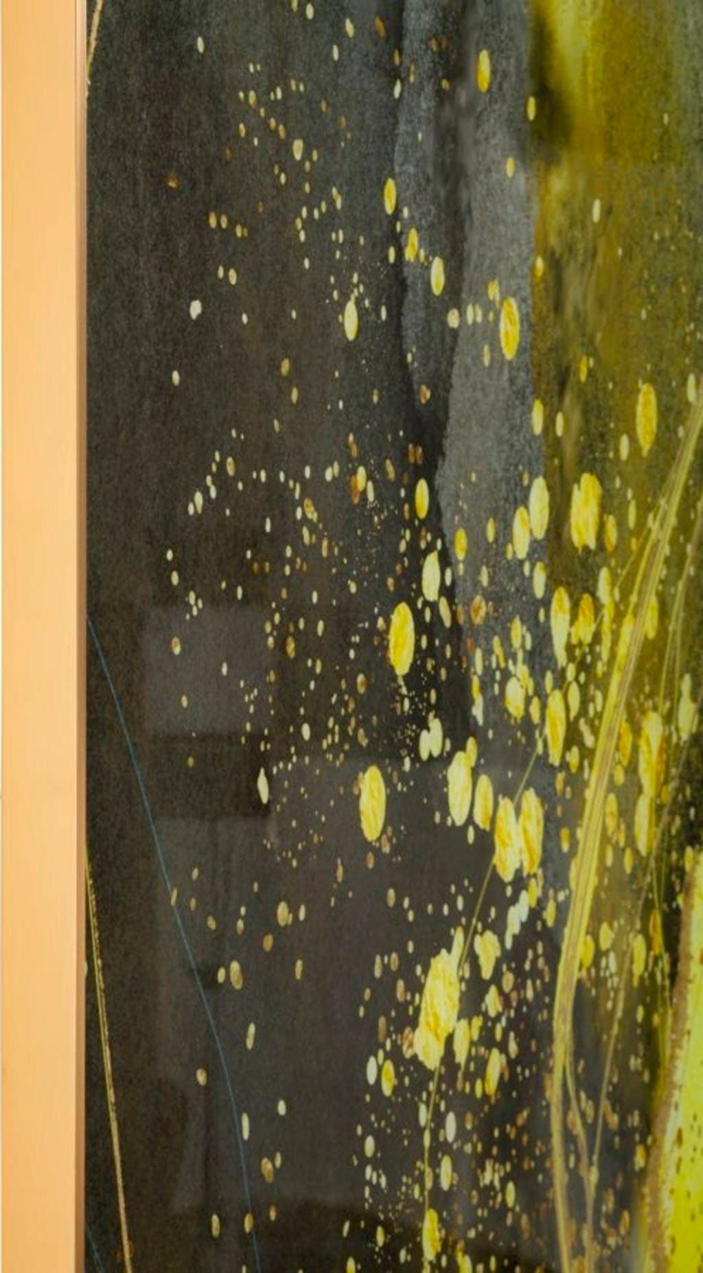 Enclosed in a simple, golden metal frame, the artwork looks particularly sophisticated and modern. Thanks to the smooth glass surface, vivid reflections are created, giving every room a bright and inspiring atmosphere. Sunny is the perfect statement piece for everyone who appreciates contemporary art and high-quality materials.
