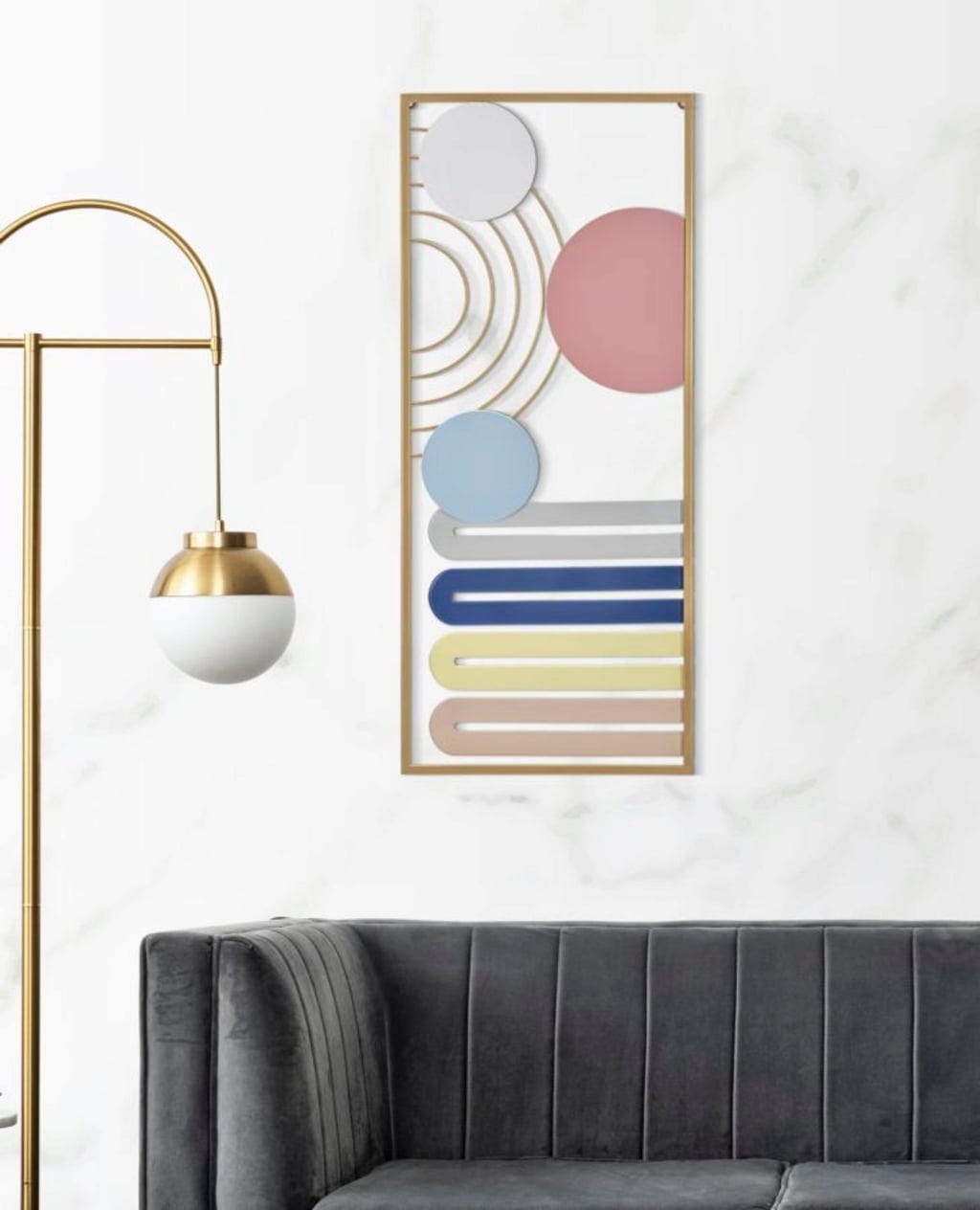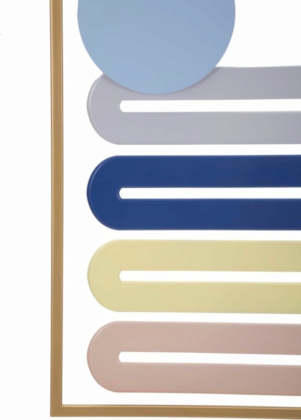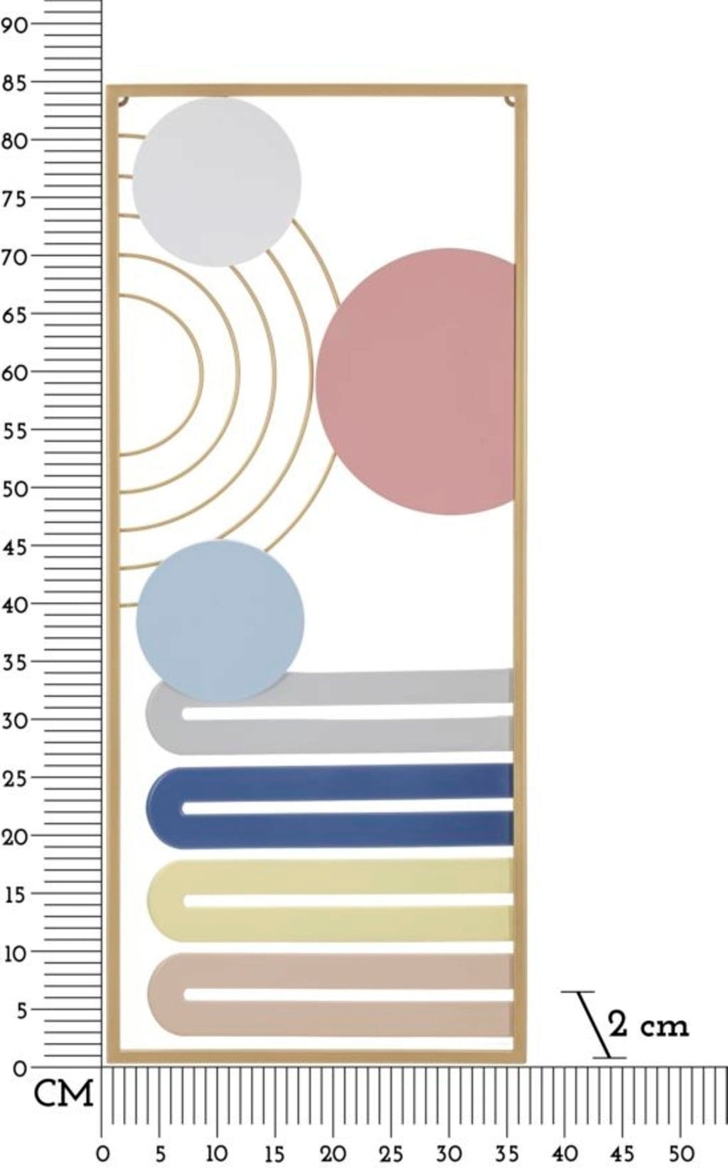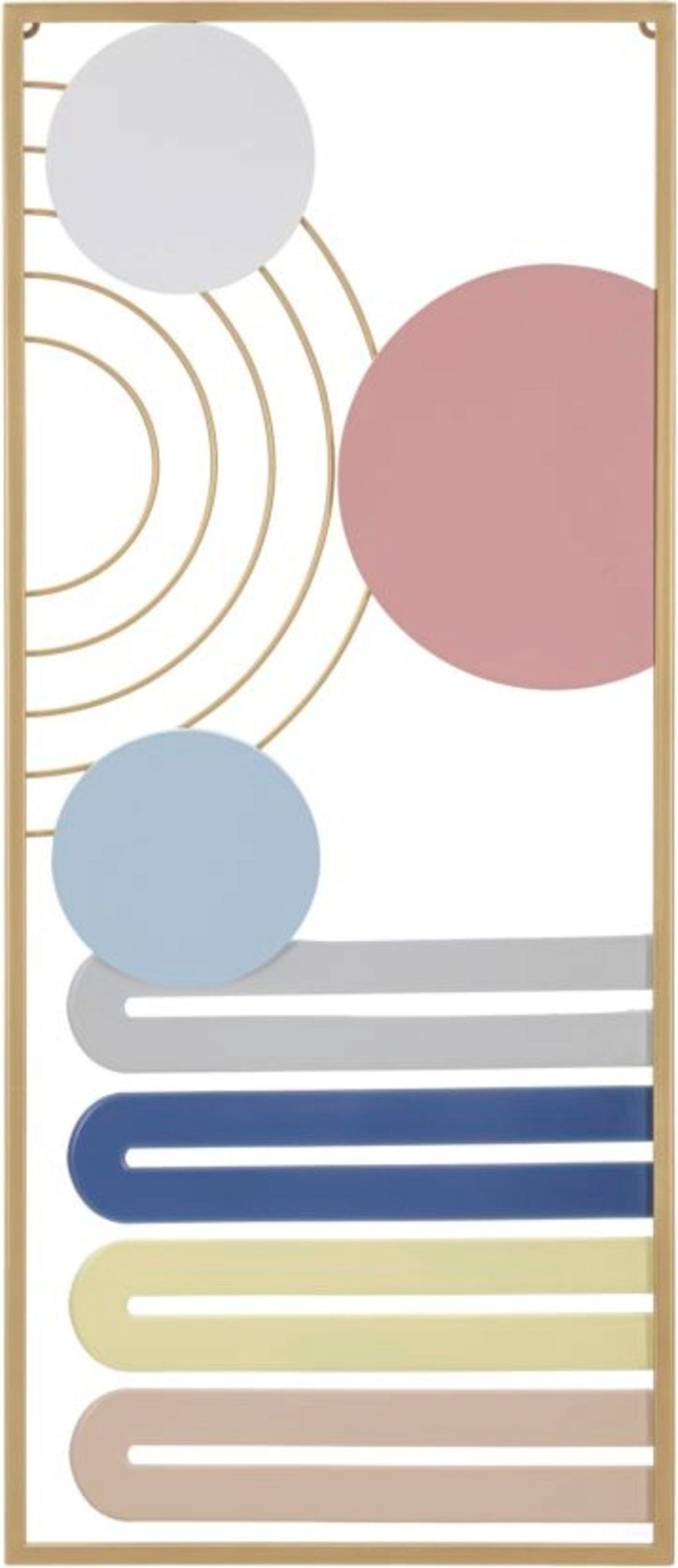 Add stylish color accents with the Wall Panel Colorful -B- by Mauro Ferretti. This decorative 3D metal object impresses with its harmonious composition of rounded geometric shapes arranged vertically in an elegant gold frame. The combination of soft pink, fresh blue, and radiant yellow instantly brings brightness and a friendly atmosphere to any room.