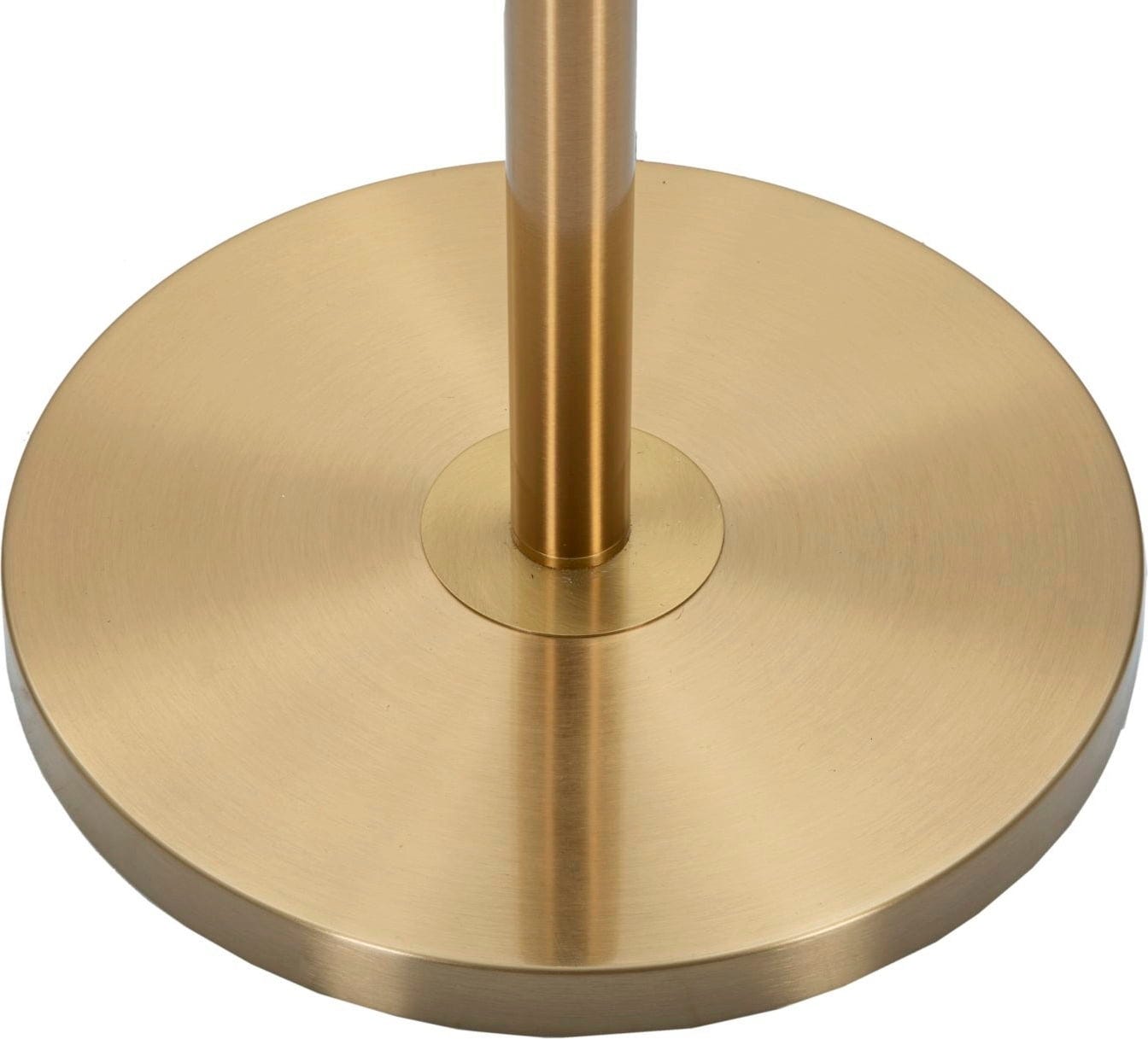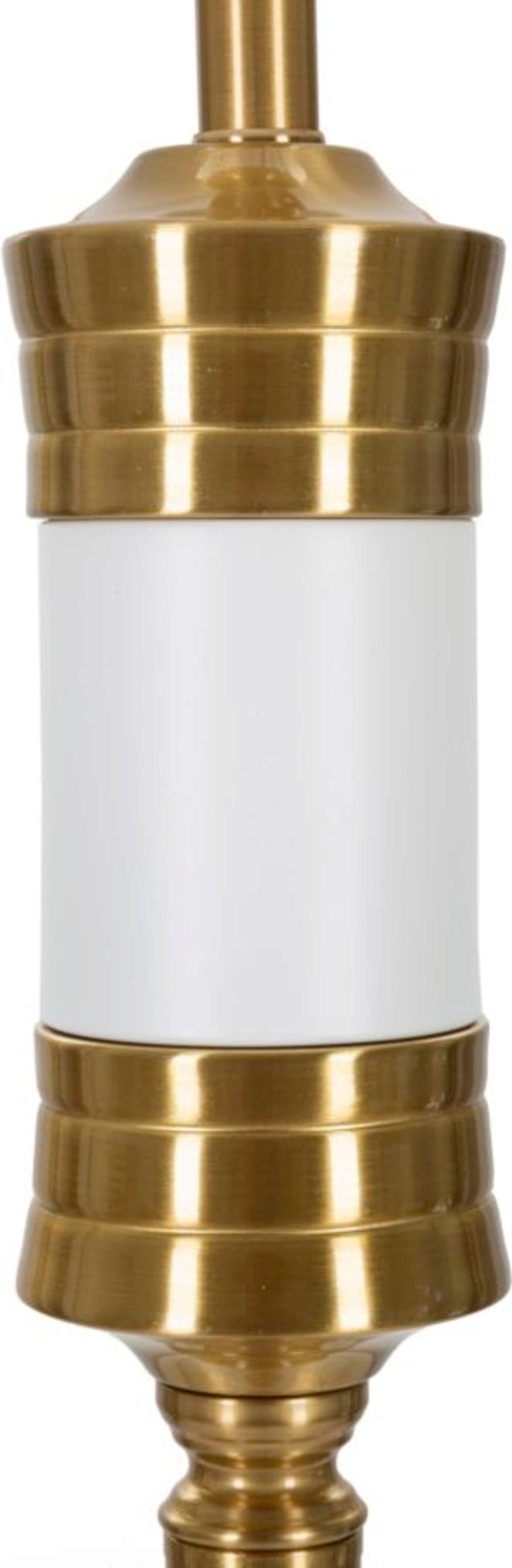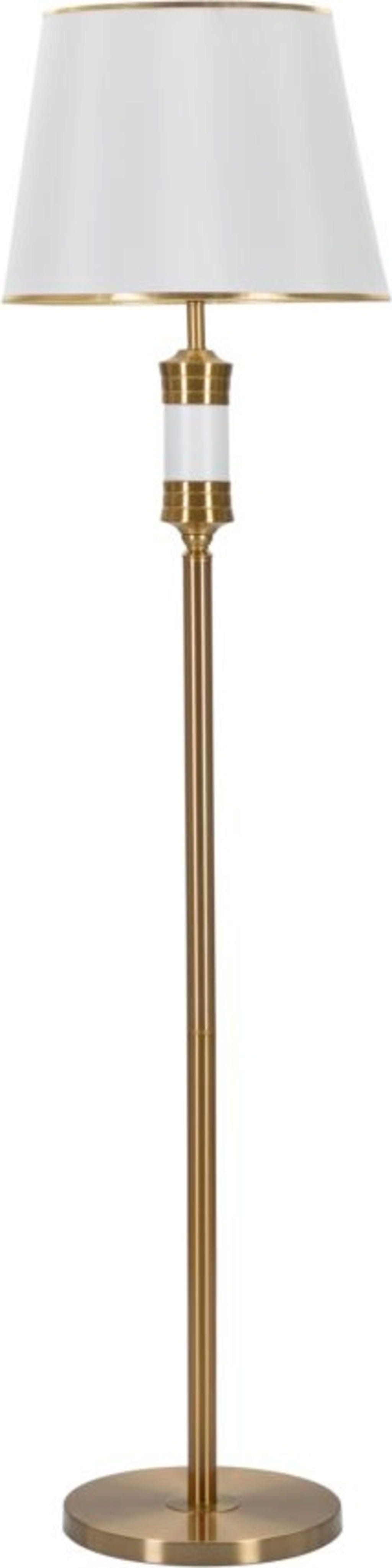 The design features a slender frame with an elegant white decoration at the top, which perfectly highlights the noble character of the gold. The lamp is crowned by a classic white fabric lampshade, whose fine gold trim gently reflects the light and creates a particularly warm, inviting atmosphere. A solid, round base guarantees a secure and stable stand at all times.
