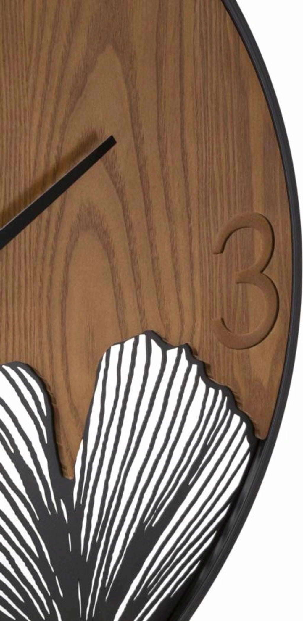 Bring timeless elegance and warmth into your home with the Wood/Leaf Wall Clock by Mauro Ferretti. The round dial impresses with its warm wood grain look, while the leaf-shaped carvings, which protrude beyond the lower edge of the clock as high-contrast black and white ginkgo elements, are a special eye-catcher.