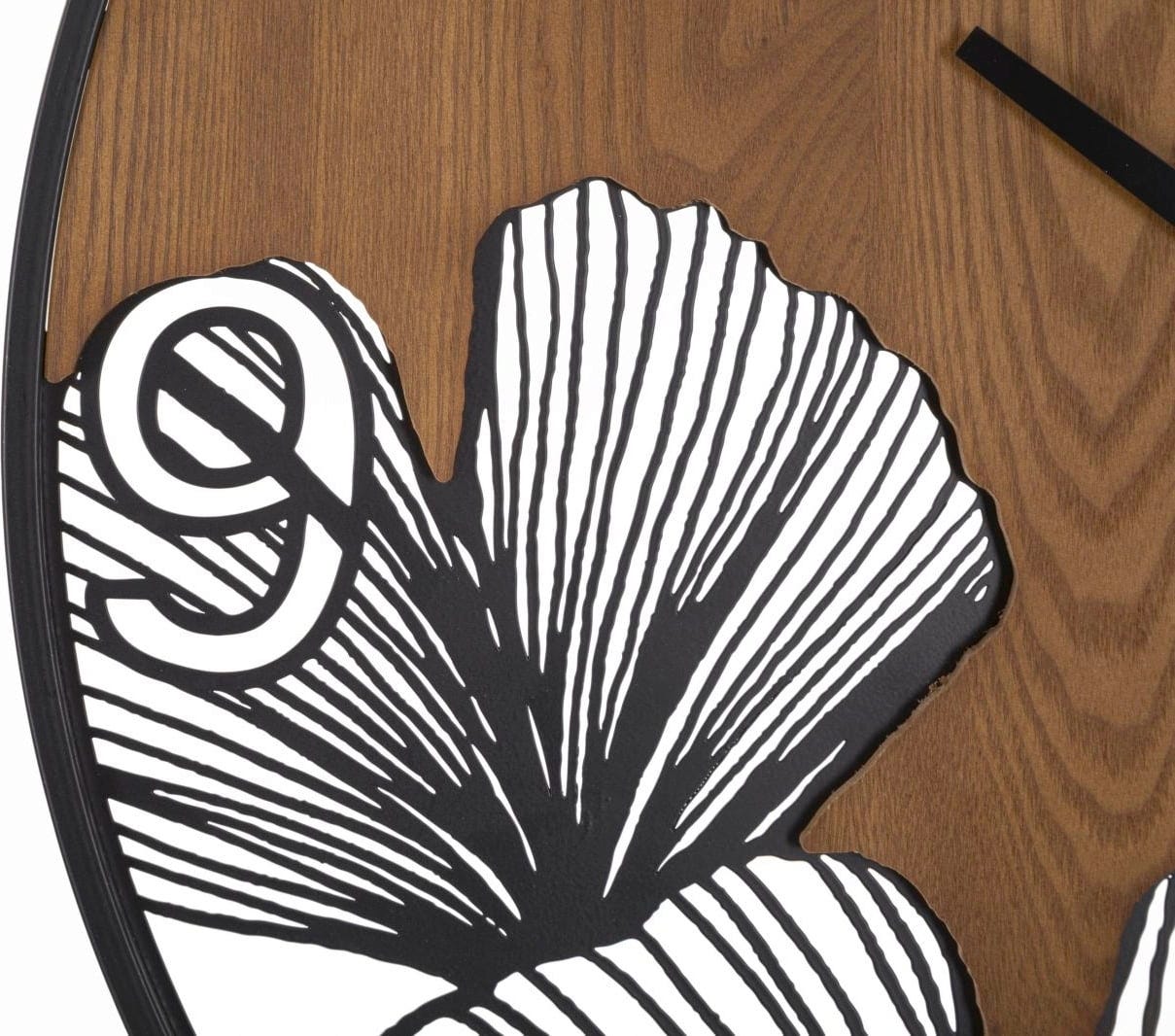 These filigree decorations also enclose the numbers 6 and 9, giving the timepiece an impressive three-dimensional depth. With its simple black hands and slim metal frame, the clock fits perfectly into modern living or working areas and creates a harmonious, nature-inspired atmosphere.