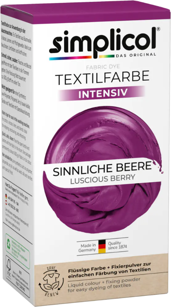 Dyeing, recolouring or refreshing textiles is easy with simplicol 's Textile Dyes INTENSIVE. The liquid dye is placed into the drum of the washing machine, allowing the colour to spread evenly. The result: brilliant, bright colours!