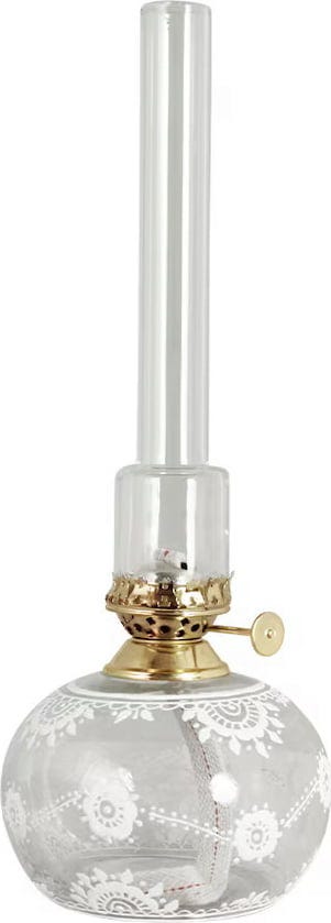 The Marja Oval Paraffin Lamp blends nostalgic elegance with a modern flair. The round, clear glass base is beautifully adorned with delicate floral designs and complemented by a refined brass burner and a glass burner tube. It casts a warm, romantic light in any room, making it a perfect fit for both classic and contemporary interiors.